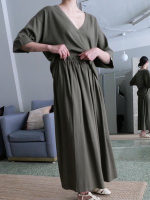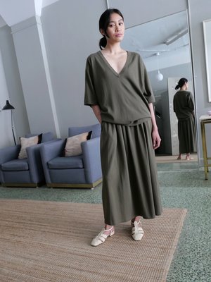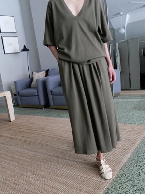 EXTREME CASHMERE N403 MARY SHORT SKIRT IN ARMY. CUT STRAIGHT IN THE BODY AND CRAFTED FROM A FUSION OF SOFT CASHMERE AND STRUCTURED BREATHABLE COTTON FOR EASE AND COMFORT. FEATURING AN ELASTIC WAISTBAND CREATING GENTLE GATHERING FOR ADDED VOLUME, AND PRACTICAL SIDE POCKETS. UNISIZE, SUITABLE FOR S-L BODIES. WAIST WIDTH IS 12 INCHES AT REST, AND TOTAL LENGTH IS 35 INCHES. MACHINE WASHABLE. (70% cotton, 30% cashmere) - Joanne is 56 with a bust measurement of 31 inches, a 27 inch waist and a 36 inch hip.