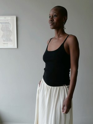 A lightweight sleeveless top with a fitted body. Crafted from a blend of cashmere and cotton for luxurious and breathable everyday wear. Designed with slender spaghetti straps and a simple rounded scoop neck. Can be worn as an essential base layer or on its own. One size, suitable for XS to M bodies. Chest measures approximately 14 inches, hem approximately 14 inches, and total length approximately 21 inches. Machine washable. 70% Cotton, 30% Cashmere. Yolonda is 510 with a bust measuring 35 inches, a 27 1/2 inch waist, and 39 1/2 inch hip.