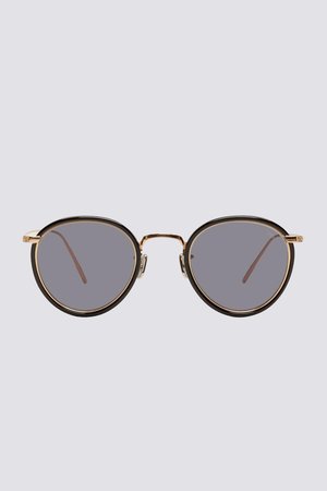 Round sunglasses in a black acetate and gold-tone metal. Titanium nose pads in silver-tone. Grey lenses with 100% UV protection. Engraved detailing at temple tips. - Handmade - Made in Japan
