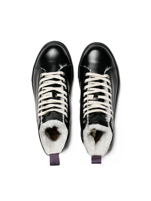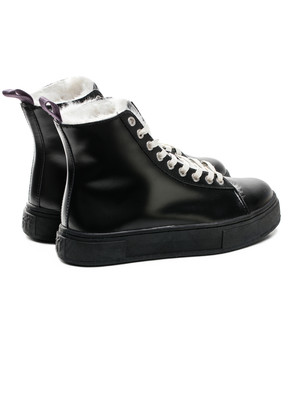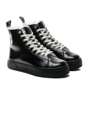 Inspired by traditional army boots, Eytys gives us the Kibo, made from a fine grained leather with a soft sheen. These high tops are faux-fur lined, with a thick rubber sole, their signature cork footbed and purple pull tab at the back. They come with an extra pair of black waxed laces. - Designed in Sweden - 100% leather outer - European sizing