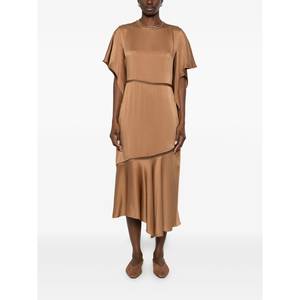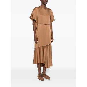Women > Clothing > Dresses Brown dress with a round neck, short sleeves, and zip fastening.