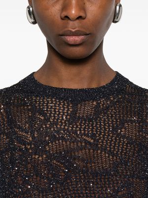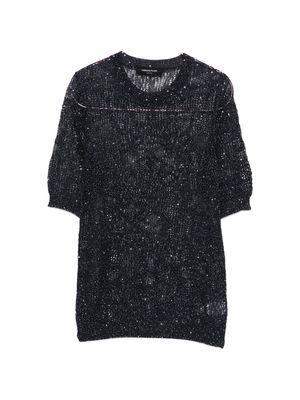 Women > Clothing > Topwear > T-Shirts Blue T-shirt featuring sparkle embellishments, a crew neck, short sleeves, and an open knit design.