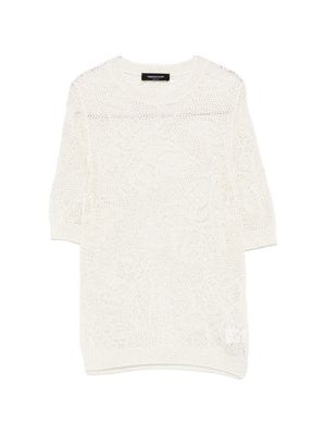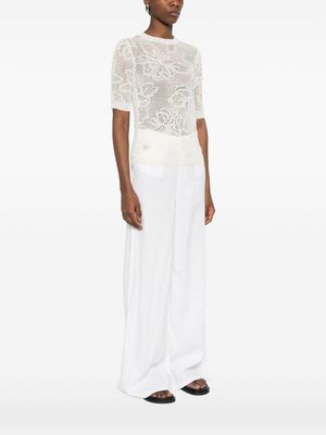 Women > Clothing > Topwear > T-Shirts Beige openwork design crew neck T-shirt with short sleeves and sequin embellishments.