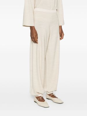 Women > Clothing > Pants & Shorts > Pants Light beige knitted trousers with an elasticated waistband and cuffs. Composition: 34% Merino Wool, 30% Cotton, 28% Viscose, 8% Polyester.