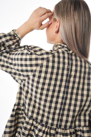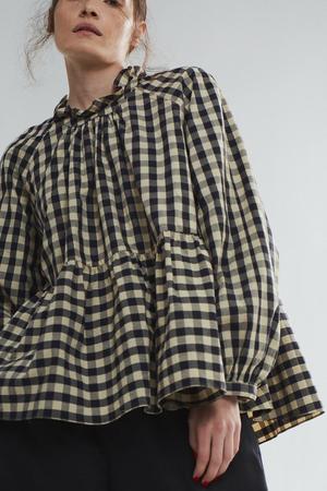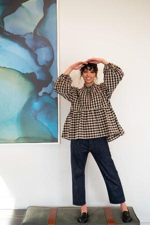 The Amandine shirt is a charming whimsical blouse with great details. A-line with slight gathering at center seam, back zip, full sleeves and delicate ruffle neck. Great with a narrow or a full bottom depending on your build and desired look. Shown with navy Cayul Pant. Handmade in LA using Japanese cotton Hand wash, hang dry and low iron if desired Aline shape with back zip, ruffle collar and full sleeves with button closure Model is 5 foot 8 and wears size XS