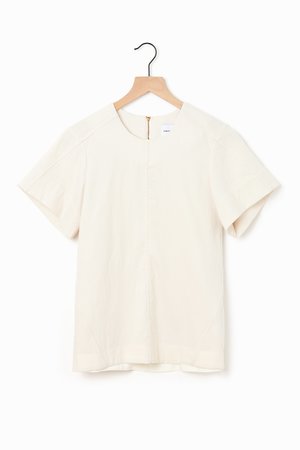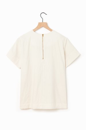 Perfect transition to spring with this alabaster short sleeve trapeze top. Beautiful stitch and seam details on sleeves & body. Designed for an oversized fit but can be easily scaled down with a front tuck into your favorite bottoms. Features brass tone zipper in back. 58% Cotton, 42% Wool.