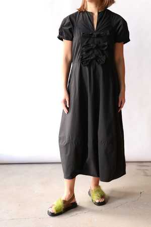 This mid-length dress features distinctive lantern sleeves and a sculptural side seam for a flattering silhouette, with practical side pockets for everyday functionality. Raw edge ties at the center front add an edgy, modern touch. Crafted from custom-dyed, high-density lightweight paper cotton, it is breathable, durable, and effortlessly chic for any occasion. - 100% Cotton - Hand wash and hang to dry - Made in USA - Model is 5'4" wearing size XS | Model wears a size 0 (XS) in tops and size 24 (0) in bottoms.