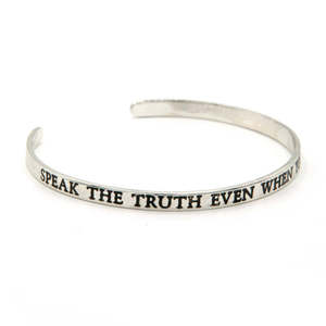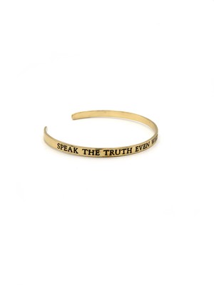 "Speak the truth, even when your voice shakes." This bracelet is made from recycled brass-plated or silver-plated metal. It is nickel-free.