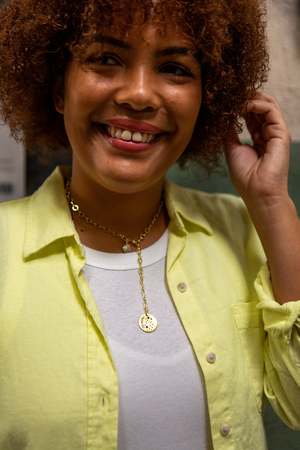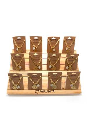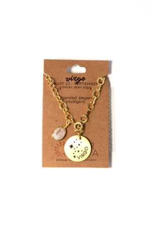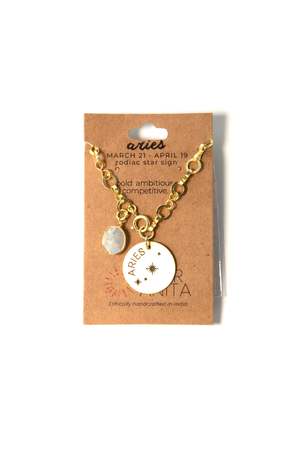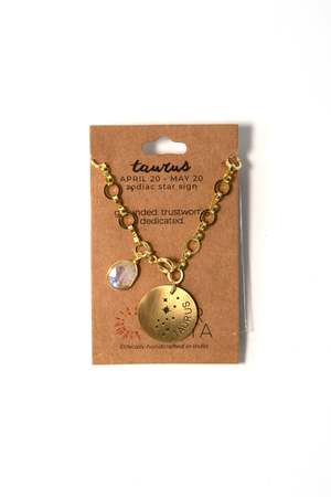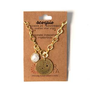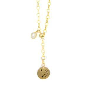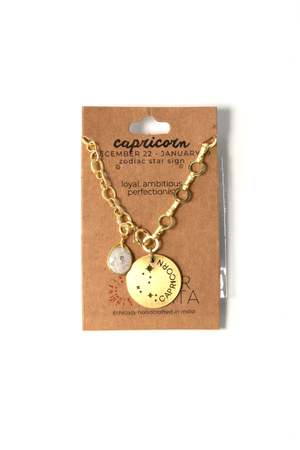 Adorn yourself with your star sign's necklace and watch heads turn! Featuring the zodiac sign's actual star constellation. Feel extra good knowing it's ethically made. So, go ahead and wear your sign with pride! Clasps in the front. Wear as a full circle, drop pendant, or even as a wrap bracelet! Made from gold-plated recycled brass. Semi-precious moonstone. Nickel-free. Chain measures 18.75". Learn more about the women who make the jewelry in our India Collection.