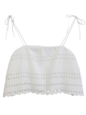 The Abajo Top by Faithfull The Brand is a cropped eyelet top with spaghetti tie straps on the shoulders. Lined in cotton. Pair with the Abajo Skirt for a matching set. Product Details Designer ID: FF4521-RBW Color: White Composition: Main: 65% Polyester, 35% Cotton; Lining: 100% Cotton.