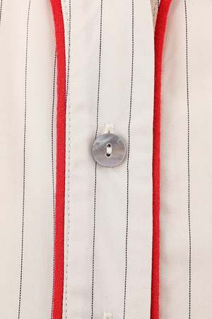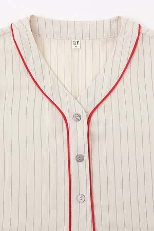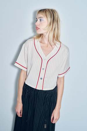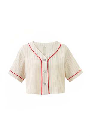 DETAILS: Cream with red stripe baseball crop top. Red piping along sleeves and collar. Baseball logo2 on side. Mother of pearl buttons. 100% Tencel. XS: Bust 38", Length 16.75" S: Bust 40", Length 17" M: Bust 42.5", Length 17.5" L: Bust 45.5", Length 18.25" XL: Bust 48.5", Length 19" 1X: Bust 52.5", Length 20.5" 2X: Bust 56.5", Length 21.75" 3X: Bust 60.5", Length 23" 4X: Bust 64.5", Length 24"