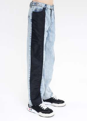 Relaxed fit reconstructed paneled jeans in blue. Features a full-body detailed panel along the right leg. Classic five-pocket styling. Belt loops at the waist. Zip-fly fastening. Finished with silver-tone hardware and a leather logo2 patch at the rear hem. Relaxed Fit 100% Cotton Imported Model is wearing a size S Model is 6 (183 cm), 125 pounds (56 kg), usually wears M in tops. A size 29 in denim and 46 in trousers. Size 10 in shoes.
