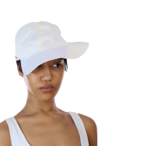 Cotton twill cap in off white. Paneled crown with a permanent creased body and staggered brim construction. Contrast chartreuse stitching throughout. Curved top layer brim over a soft under brim. Silver-tone logo2 hardware at side. Velcro fastening at back. CARE 100% Cotton Denim Spot clean only. Do not machine wash.