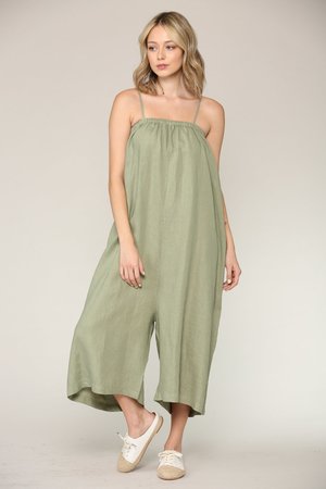 A comfortable yet flattering ethically-produced linen jumpsuit. Features thing straps and an elastic chest with loose pant. Lightweight and 100% linen. Filosofia apparel is ethically and sustainably produced. Their clothing pays homage to classic silhouettes, yet is modernized through mindfully sourced materials and practical details for the contemporary wearer. The thought and intention behind every garment is apparent, lending to the individualized, handmade feel of each item. Model is 59 and wears a size small. Measurements are taken flat. Size XS Chest 11" (relaxed, elastic) Length 38.5" Size S Chest 12" (relaxed, elastic) Length 39" Size M Chest 13" (relaxed, elastic) Length 39.5" Size L Chest 14" (relaxed, elastic) Length 40"