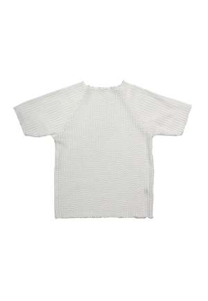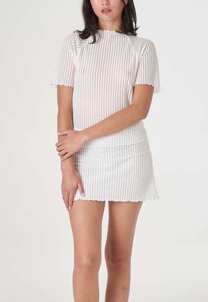 This sophisticated piece features raglan sleeves for a relaxed fit and a refined mockneck that adds elegant structure. Crafted from premium seersucker fabric, the subtle texture creates visual dimension while maintaining a clean, crisp appearance. Versatile and effortlessly chic, this top elevates any outfit with understated luxury. COMPOSITION Polyester, Elastane SIZE & FIT Fitted Model is 5'8" and is wearing size XS/S.
