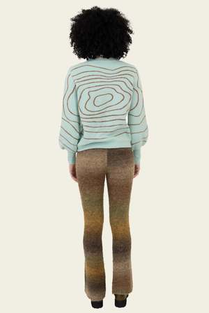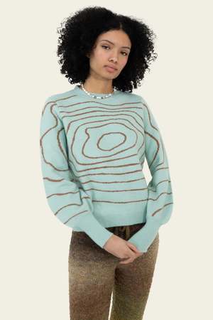 Comfy and cozy printed jacquard sweater with bubble sleeves. Loose Form Fitting True to size Acrylic, Nylon, Wool, Spandex Emmah is 5'9" and wears a size XS/S
