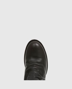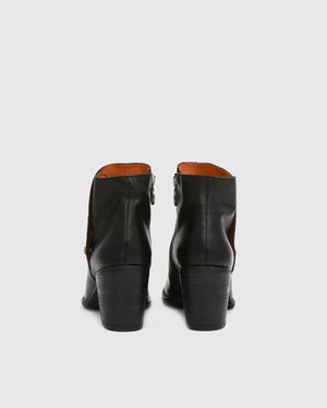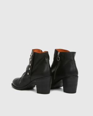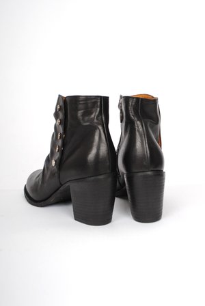 Black natural leather ankle boots with metal stud buttons and inside zip. Leather lining. Stitched leather and custom rubber sole. 6.5 cm stacked heel.