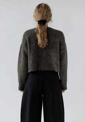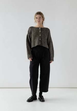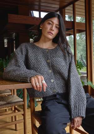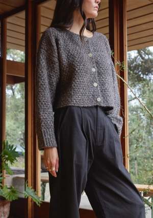 This beautiful alpaca cotton yarn is a customer favorite for a reason. The blend of cotton and alpaca creates insulation and volume with a surprisingly light overall weight, and the undyed yarns create a beautiful and subtle melange. Designed with a slightly oversized fit and textured chunky stitch, it closes with horn buttons down the center. Details: - 56% Alpaca, 44% Cotton (Fair Trade, undyed) - Proudly made in a Fair Trade Peru certified facility - Spot clean by hand - Dry clean only Size + Fit: Model in studio is 5'9" and wears a small. *Each sweater is knit one at a time; some size variation may occur.