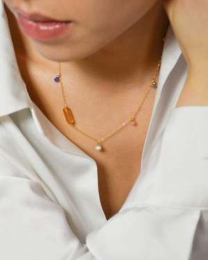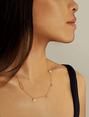 An ode to alpine meadows, tide pool treasures, crystals of exceptional lightness, and gems from the depth of the earth: the Meadow Necklace by Fluidwavy. This piece is a delicate 14k gold-fill chain hung with freshwater pearl, Swarovski crystal, aquamarine, and glass beads. - Length: 19" - Handmade in Vancouver, BC All Fluidwavy items are handmade; appearance may vary slightly from stock images.