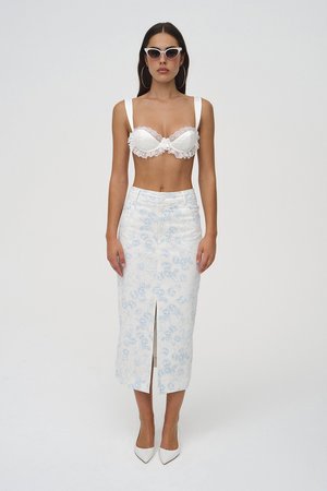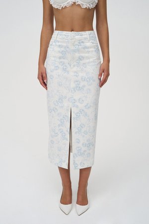 Step into spring with the Chantal Midi Skirt, a whimsical denim skirt with an allover swan French toile print and slit at the center front. - Midi denim skirt. - Center-front button and functional zipper fly closure. - Functional front and back pockets. - 4-pocket design. - Slit at the center front. - Pencil skirt silhouette. - Midi length. - Fully lined. - Allover swan French toile print. - Color: Blue. - Material: Self - 97% Cotton, 3% Spandex; Lining - 100% Cotton. - Measurement: Length - 29 (74 cm). - Model is 59.5 (176 cm), Bust 32C (81 cm), Waist 24" (61 cm), Hips 34" (86 cm), and is wearing a size S. - Hand wash cold separately. Do not bleach. Lay flat to dry. Cool iron if needed. Do not dry clean.