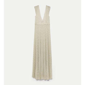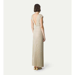 A delicate pattern like a light texture adorns this pleated dress in diamond jersey, with feminine lines and a softly flared skirt. Naturally elegant, this long dress reveals the neckline with a deep V cut both in front and at the back, enhanced by a fitted bodice and gently flaring skirt. The lurex thread running through the jersey adds a luminous, subtly glamorous touch. Dress made in Italy. Materials and Care: - 70% viscose 15% polyester 15% polyamide - Do not wash in water, do not bleach, do not iron, professional dry cleaning mild process, do not tumble dry.