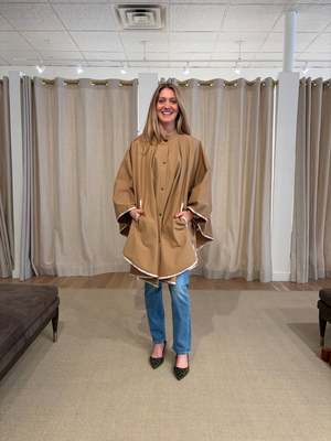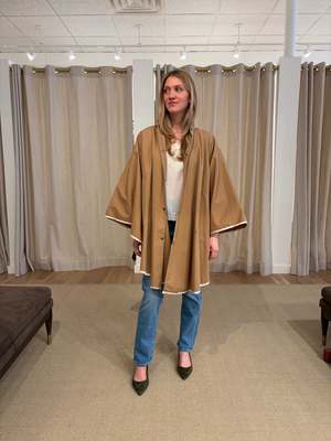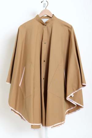The rain cape in water-repellent twill protects from morning mist and sea spray. Wide and flowing, it fastens high on the neck and plays with contrasting colored ribbons along the edges and pockets, creating a joyful interplay of colors that herald the arrival of spring. 75% cotton 25% polyamide.
