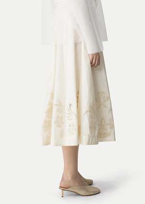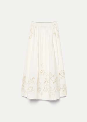 This Forte Forte skirt is crafted from crisp cotton poplin with exquisite openwork embroidery. The embroidered seashells scattered across the fabric create delicate transparencies and a sense of sensuality. This skirt features a flared silhouette, an elastic waistband with a zip and button closure, side pockets, and a midi length. Fits true to size. The model is wearing a size 1. 100% cotton. Hand wash cold or professional dry clean. Made in Italy.