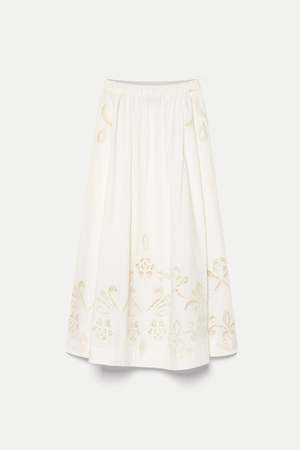 Light as the spring breeze, this poplin skirt flares gracefully, revealing exquisite openwork embroidery. Seashells scattered across the fabric like tiny marine treasures create delicate transparencies and a sense of sensuality an artisanal skirt that captures the full spirit of the new season. Composition 100% cotton Care Hand wash, do not bleach, iron at a maximum temperature of 110C / 230F, professional dry cleaning normal process, do not tumble dry, line dry in the shade.