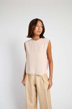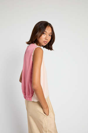 This reversible top features two lightweight layers for versatile styling. One layer is 100% cotton and the second layer is 100% silk. 2 layers - One layer: 100% cotton - Second layer: 100% silk - Reversible design