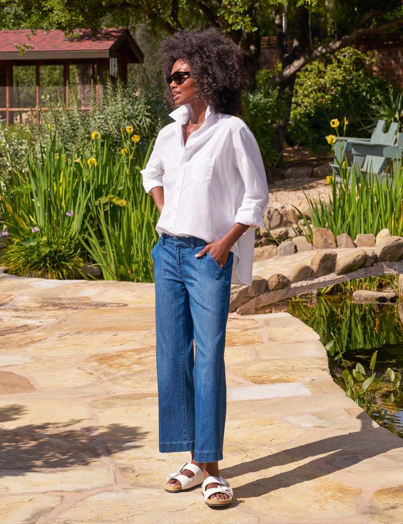 Say hello to Westport, the ultimate Italian wide-leg chino. Westport's smooth contour waistband, handy pockets, and finished hem create an elevated, wearable bottom to build your everyday looks around. This is the chino you didn't know you were missing. - Italian Dream Light Denim: 91% Cotton, 7% EME, 2% EA - Cropped clean block hem - Inseam: 26.5", front rise: 10", leg opening: 18" - Front slant pockets and back welt pockets - Contour trouser waistband with zip fly and hook-and-bar closure - Mid-rise, wide-leg fit