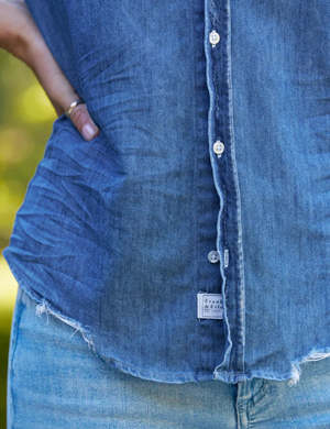 Barry is the closet essential. Classic in style and sharply tailored to hug your waist and back, Barry curves in all the right places. Notice our signature single pocket, hip-skimming hemline, and bust-flattering button placement. - Famous Denim: 100% Cotton - Hand-distressed raw hem hits right at the hip - Tailored like an hourglass to hug your curves - Back center seam follows the curve of your back - Signature bust flattering button placement with chest pocket and long sleeves with button cuffs - Fit runs true to size