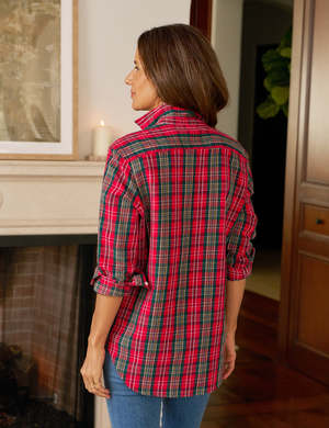 The Eileen Relaxed Button-Up Shirt by Frank & Eileen features a relaxed fit that flatters every figure. It is generously cut with signature bust-flattering button placement. Details include a shirttail hem long enough to cover your bum, soft rounded shoulders with no back pleat, a chest pocket, and long sleeves with button cuffs. Made from midweight Italian flannel (100% cotton). Paloma is 5'9" with a 34" bust wearing a size S.