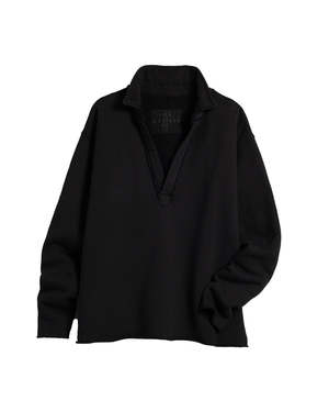 The Patrick Popover Henley in Black by Frank and Eileen is a henley-style, v-neck top featuring a raw-cut hem and relaxed collar. - 100% Cotton - Made in California - #LAB510TF