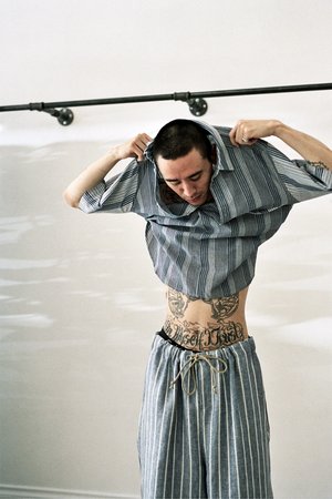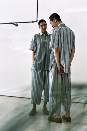 100% medium weight linen Made from two alternating striped vintage fabrics Four button closure Single chest patch pocket Side split uneven hem Made in Germany