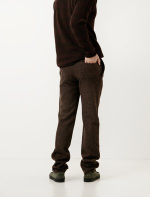 These traditional trousers are made of a weighted canvas-like wool, of brown and tan tones. The pant has a trim straight fit, half lined interior for comfort and heavy cotton pocketing in contrast colours. Further details include: vintage melamine button fly, slant hip pockets and interior deer leather loops for hanging. Ready for both formal and casual wear, the trouser will keep you warm through the Fall and Winter seasons. - Made in Germany - 100% wool - Regular fit - Dry clean - Model is 5'11", 155 lbs and wears size medium
