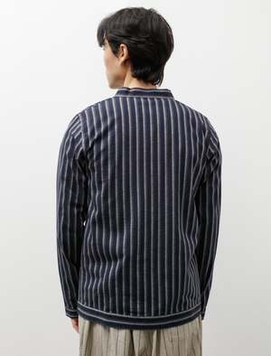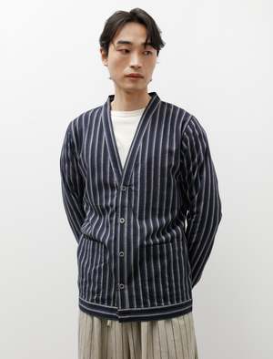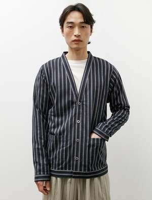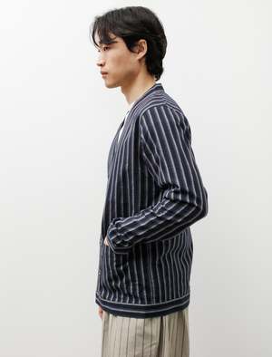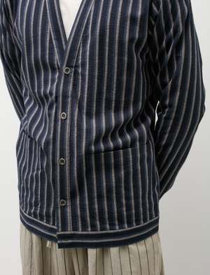 A slim relaxed fitting woven cardigan cut from a slubby jacquard cotton stripe in mixed blues. Features a clean finished cardigan style neckline with collar pieces extending through to the hem and rounded patch pockets at the waist. All hems are clean finished with double layered bands for added structure and an elegant surface at the exterior. Constructed with french seams and a flat felledarmhole for a durable finish that will last many years to come; completed with gunmetal toned metal buttons. - Made in Germany - 100% cotton - Slim, relaxed fit - Dry clean only - KIM IS 6'1", 155LBS AND WEARS SIZE MEDIUM