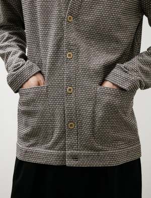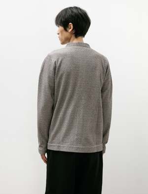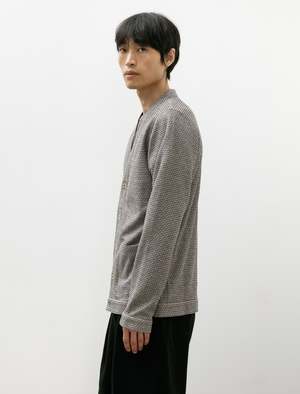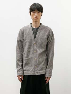 A trim fitting, tailored cardigan cut from a lightweight double-knit cotton in a grey, beige, and navy melange. Features a classic y-neckline, on-seam hand pockets at the waist, and banded cuffs at the sleeves. The tailored fit is ideally suited to summer layering, adding colour and texture to any ensemble without excessive weight. Constructed using fine french seams throughout and a flat felled armhole for improved comfort through the shoulder; melamine buttons.