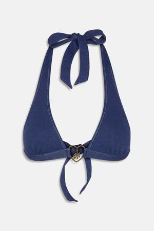 Lounge on the beach all day in the Frank halter bikini top from the Bella Hadid x Frankies Bikinis collaboration. Features moderate support, full coverage fit, adjustable ties at the back and neck, and a special heart charm. Made from denim swim fabric. Style #: 10509DS SMDP.