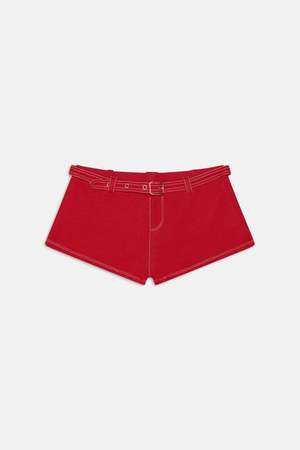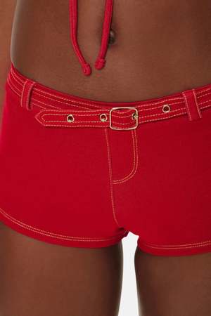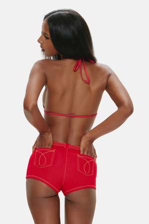 The Wrangler booty shorts bring a western edge to your summer wardrobe. These tiny yet supportive shorts feature medium back coverage. Whether styled over a bikini or worn on their own, these shorts are a showstopper. - Color: Red Denim - Soft denim swim fabric - Contrast stitching - Back pockets - Special belt detail with belt loops - High support - Medium coverage - Pant stitch details - Style #: 41158DS
