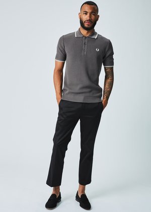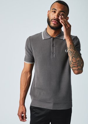 Fred Perry's Reissue Textured Knit Polo is made with a cotton ribbed knit, a three button placket and white striped detailing on the cuffs and collar. Details - Point collar. Short sleeves. Branding at the chest. - Shoulder 18", 20" chest, 29" length (approximately). - Hand wash cold or dry clean. - Made in Italy. Color anthracite. 100% cotton. Shirt runs true to size with regular cut. Model is wearing a medium, Greg is 6'1", Suit 40", Waist 31", Inseam 32".