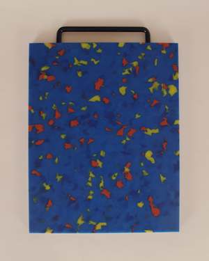 Large confetti cutting board made from food-safe plastic with a sturdy handle for easy storage. DETAILS: 11 x 16 in | Food-safe plastic, dishwasher safe | Designed and produced in Brooklyn.