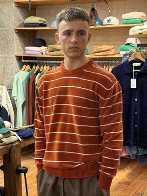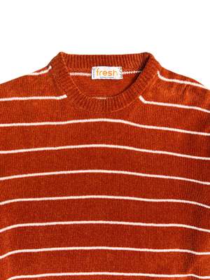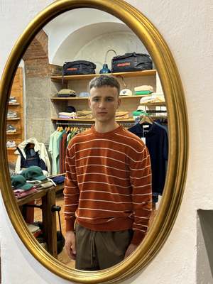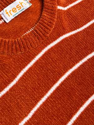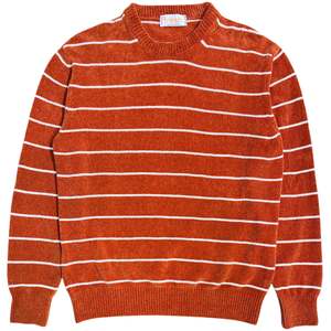 Designed in Turin and made with care in Veneto, the Manny sweatshirt combines relaxed comfort with eye-catching style. Crafted from soft, lightweight chenille, it offers a plush feel without the weight, making it ideal for year-round wear. The burnt orange base is brought to life with crisp horizontal white stripes, creating a bold yet balanced look. With a regular fit, the Manny is easy to wear and effortlessly stylishperfect for adding personality to your casual wardrobe. SIZE S M L XL BODY LENGTH 66.5 68 69.5 71 CHEST 52 54 56 58 SHOULDERS 41.5 43 44.5 46 HEM 45 47 49 51
