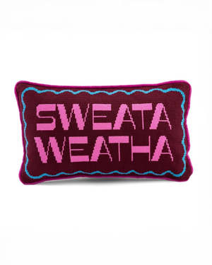 The Sweatea Weatha Needlepoint Pillow by Furbish Studio features playful embroidery on the front and a luxe velvet backing. This decorative pillow measures 9" x 15". Front: 100% Wool Back: 100% Cotton Velvet Made in China.