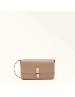 Women > Bags > Clutches Leather clutch bag in dove gray with magnetic closure, embellished with cylindrical metal elements and finished with the iconic Furla arch logo2. Features one internal zip pocket, printed Furla logo2, and a removable and adjustable leather shoulder strap. Composition: 100% leather Dimensions: width 24 cm, height 14 cm, depth 6.7 cm Made in China.