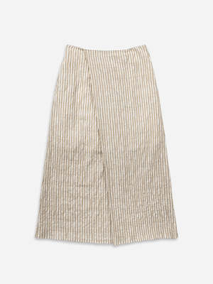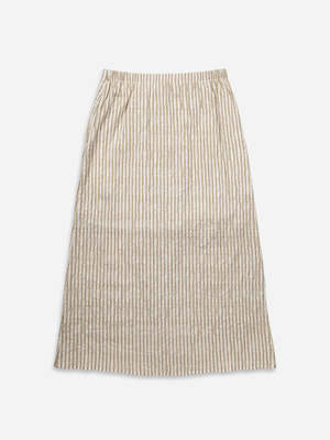 A clean A-line midi skirt with a softly overlapped front panel that follows the vertical stripe direction, creating a long, streamlined look. The lightly structured organic cotton-blend outer and pure cotton lining keep it breathable and comfortable for everyday wear, easy to style with fitted tanks, crisp shirts, or lightweight knits. - Main: 66% Organic Cotton, 26% Polyester, 7% Cotton, 1% Spandex - Lining: 100% Cotton - Pre-shrunk: Washed - Mid waist - Elasticized waistband - 2 side pockets - Wrap construction at front - Puckered texture fabric lightweight, naturally low-maintenance (often no ironing needed) - Available in Seedpearl and Desert Sand Stripe Model is 57" (170 cm) wearing size S. Size Guide XS / S / M / L US: 0 / 24 / 68 / 10 FR: 3234 / 36 / 38 / 4042 Chest (in): 3233 / 3435 / 3637 / 3839 Waist (in): 2425 / 2627 / 2829 / 2930 Hips (in): 3435 / 3637 / 3839 / 3940 Chest (cm): 8184 / 8689 / 9194 / 9499 Waist (cm): 6164 / 6569 / 7174 / 7577 Hips (cm): 8690 / 9195 / 9799 / 100102