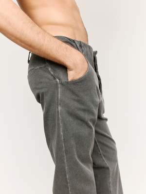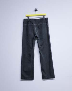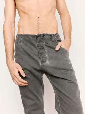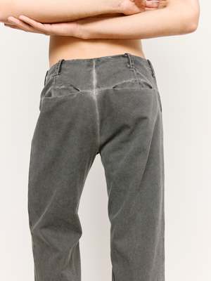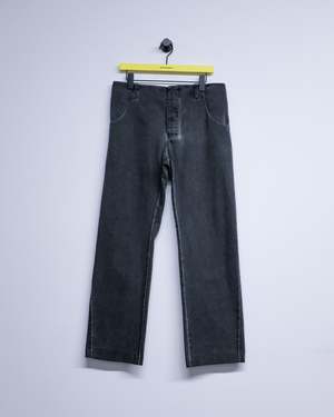 Washed black canvas straight fit trousers detailed with belt loops on the waist line. Featuring a button fly, two front pockets, and two rear seam pockets.