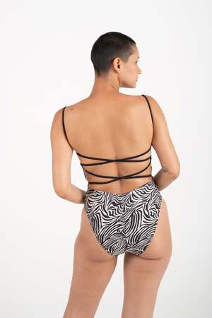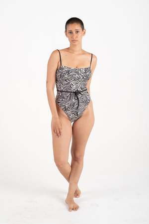 Details The Joni One Piece features a classic, streamlined silhouette. Adjustable ruched detailing at the underarms allows for the perfect fit with extra room at the bust. A squared modern neckline is complemented by a wide, open back with versatile criss-cross straps that can be tied neatly in the backside, or wrapped around the front as a slimming belt. Size - Braina wears a M - Model Measurments 5'6", 34C/D / 28"/ 39" Content + Care - Made in Los Angeles of Italian fabric. - 88% recycled Econyl / 22% Spandex