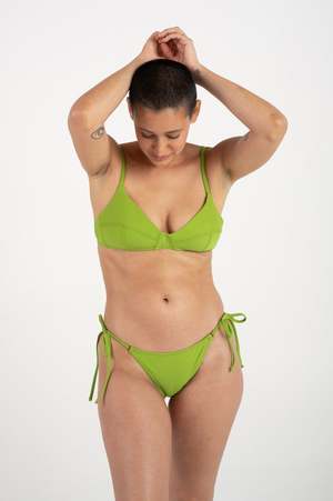 Details: A classic mix-and-match separate that works with just about everything. The Tie Bottom features slim coverage at the back and self ties with a delicate ring detail at each side, allowing for a customizable fit that can be worn as high or low at the hip as you please. Size: - Braina wears a size M - Model Measurments 28"/ 39" Content + Care - Made in Los Angeles of Italian fabric. - 88% recycled Econyl / 22% Spandex