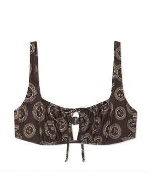 The Chemise Bra is a feminine separate inspired by vintage underpinnings. It features a wide, open neckline elevated with ruched detailing and a self-tie, peekaboo front. Complete with broad adjustable shoulder straps and side seam boning for support. A rubberized G-hook closure with a three-loop finish in the back allows for a close, customizable fit. - Model measurements: 5'9" 34D / 25 / 35 - Eden wears a size Medium - Made in Los Angeles of Italian fabric. - 88% recycled Econyl / 22% Spandex - Learn more about swim care for a suit that lasts.