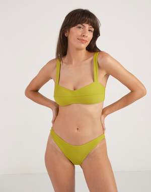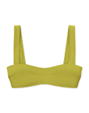 This soft-structured bandeau is minimal yet striking. It features a contour apex seam, broad shoulder straps, and a light-as-air layer of foam along the bottom bust. In back, a rubberized g-hook closure with a 3-loop adjustment provides for an individualized fit. - Model measurements: 5'9", 32C, 26.5, 37 - KJ wears a size S. - Made in Los Angeles of Italian fabric. - 88% recycled Econyl / 22% Spandex - Learn more about swim care for a suit that lasts.